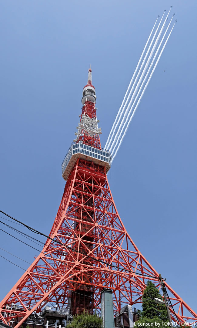 感謝! 東京タワー上空を飛行するブルーインパルス。医療従事者らに敬意と感謝を示し、青空にスモークで白いラインを描きました。